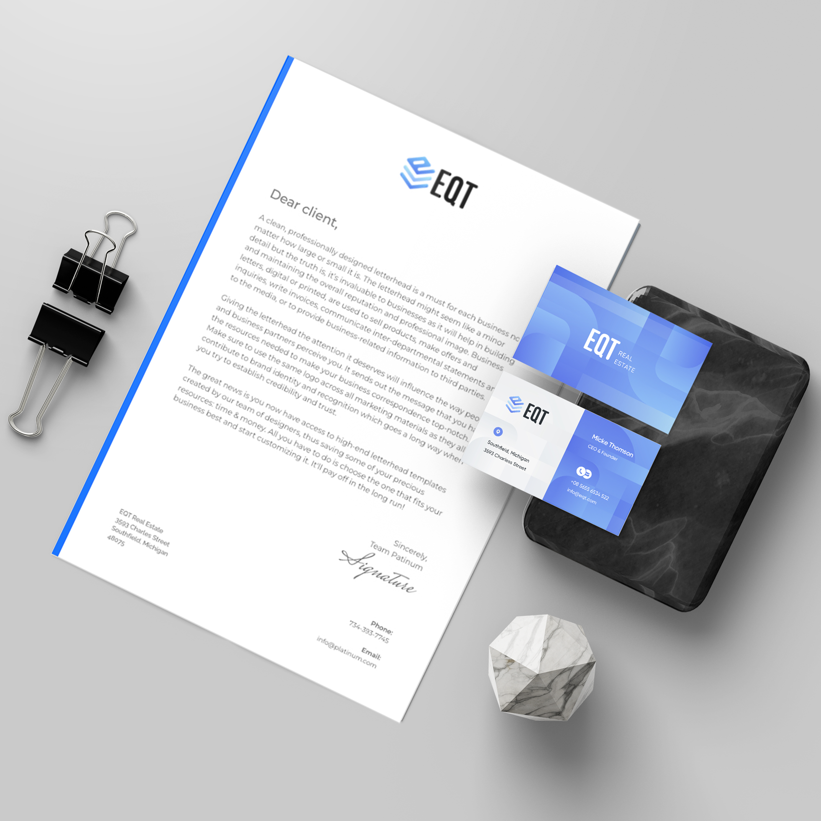 «Creation of a full branding package for EQT — a real estate agency focused on the Dubai market. From logo and typography to stationery, web presence and signage, the project establishes a unified visual language that reflects trust, structure, and growth»